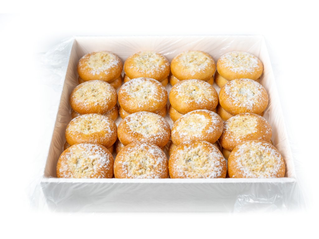 Náplň: jemný tvaroh, cukr, rozinky, pasterovaná vaječná melanž, máslo, sušená syrovátka, citronová šťáva, aroma